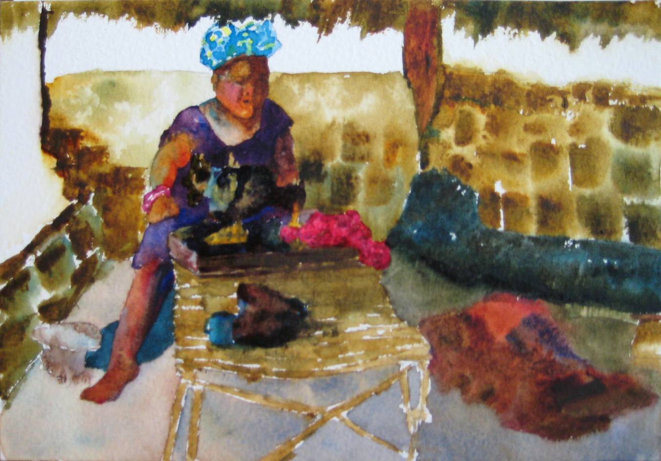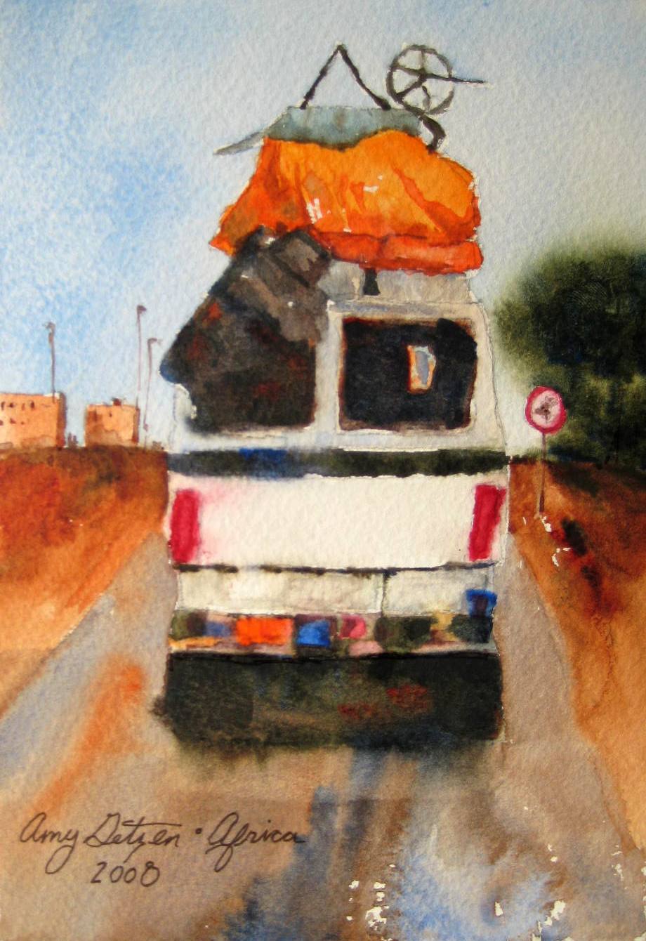 My friend Amy is doing just that – preparing the way and raising a banner for the people in Africa. She is a missionary in Africa. I love painting pictures my missionary friends send me or have posted on their blogs. Amy posted both of these on her blog. The first one is a very loaded down van on some sort of “highway”. I loved the colors and how it was stacked to the sky with stuff – last but not least – a wheelbarrow – you never know when you’ll need one of those in Africa :)! I painted this picture last night while cleaning the kitchen and cooking. I can do that since my painting “station” is my woodblock which is right in the middle of my kitchen – very convenient!