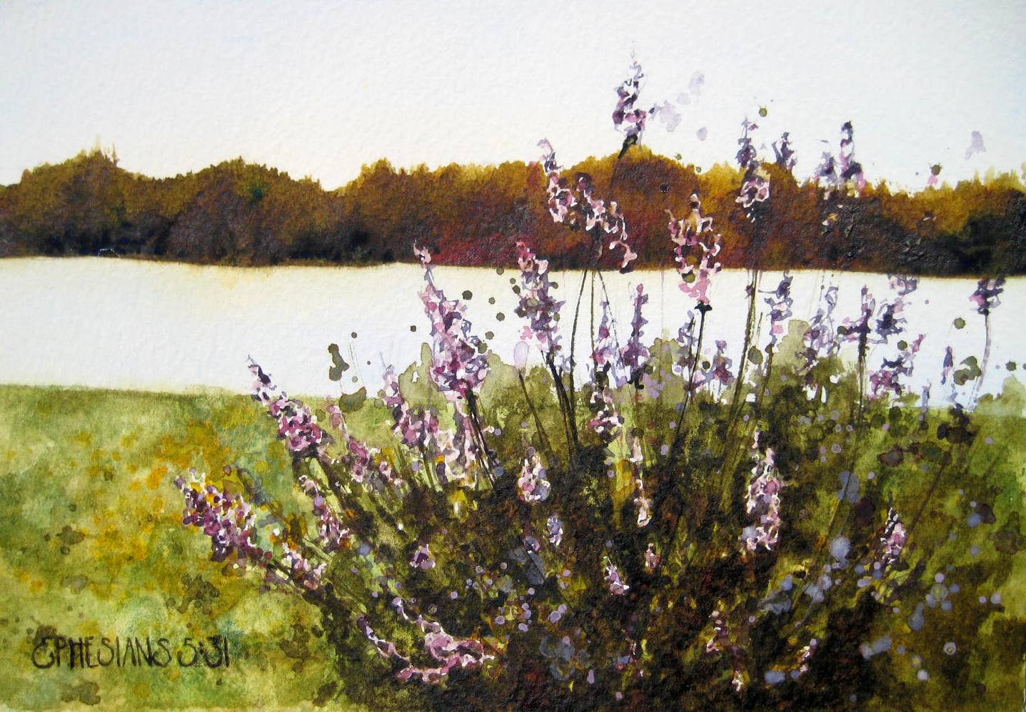 Both of these quotes were found on John Piper’s blog made by Bill Walsh.  I love both of them.  I hope it’s clear that my art is “representational” of the God of the universe – Maker of heaven and earth – He is the One I serve!  My heart’s desire is to use these art pieces for His glory – and no other’s.  This is a painting I did from some pictures of Laura’s wedding her Mom sent me.  I loved the lavender bush with the lake behind it.