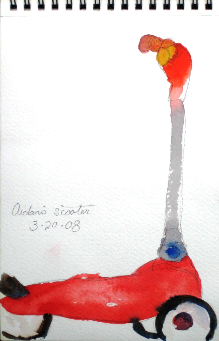 My sister’s birthday was June 24th, but we just celebrated it last night so I couldn’t post her gifts until now. She asked me last year to paint a picture of their house since it’s the home where her kids are being raised and there’s special memories associated with it. Well, I did my best – which wasn’t great, but here it is. I did 3 different versions of it and this is the one I decided on giving her – I didn’t love any of them – I don’t think this is my forte – but I’m also not a very good judge of my own work – I rarely think anything is good. I also matted a sketch for her that I did at her house while the kids were asleep of Aidan’s scooter. Happy Birthday Amanda!