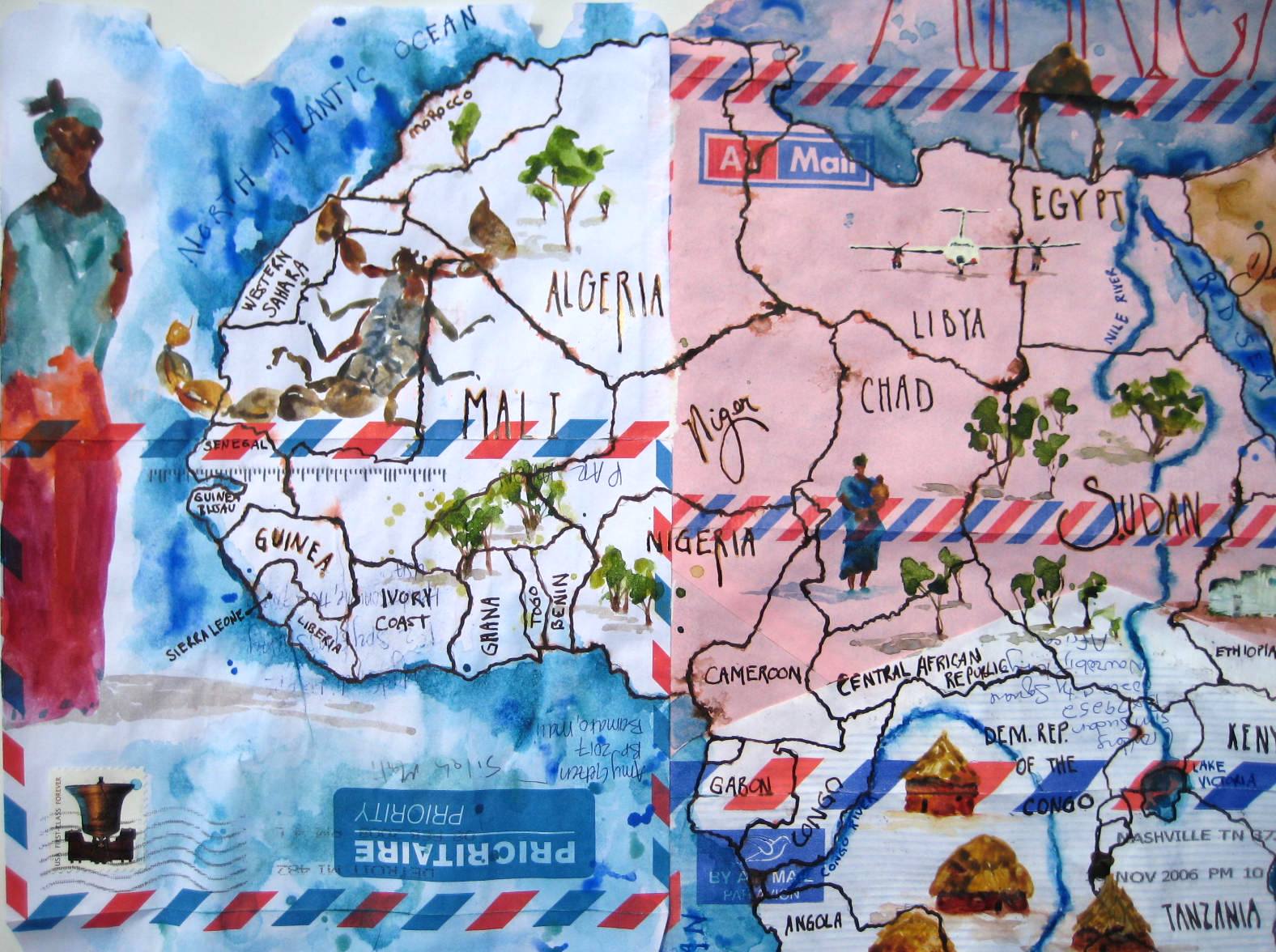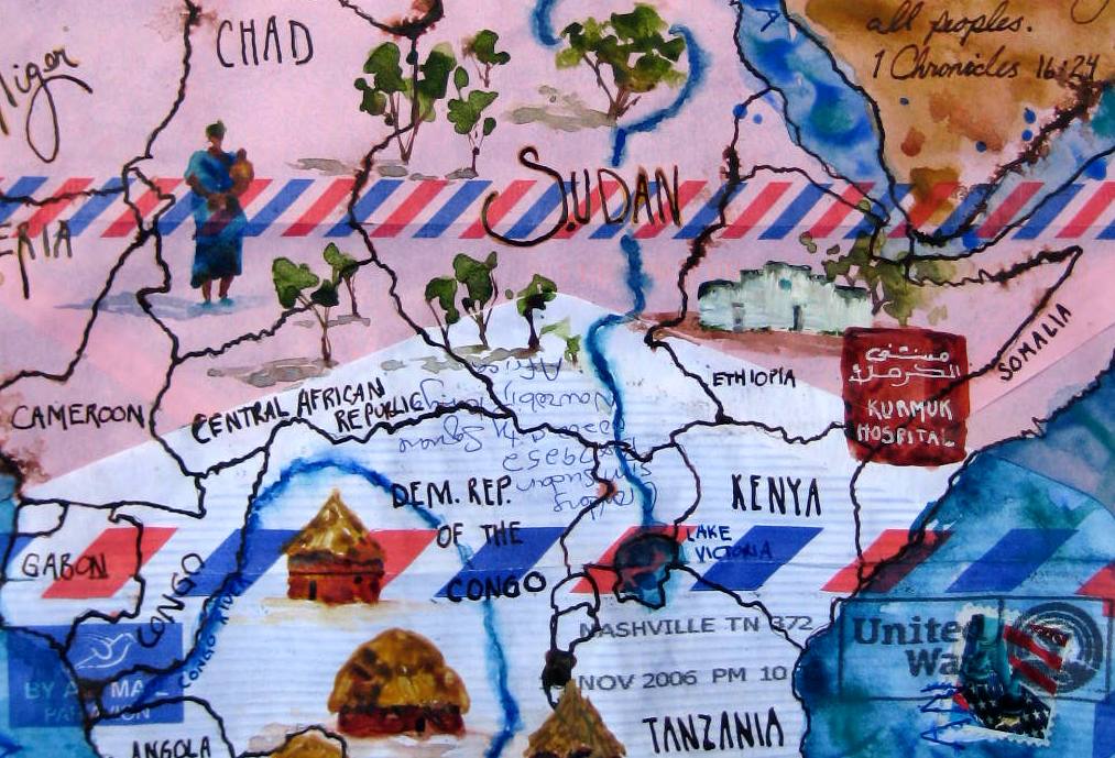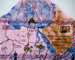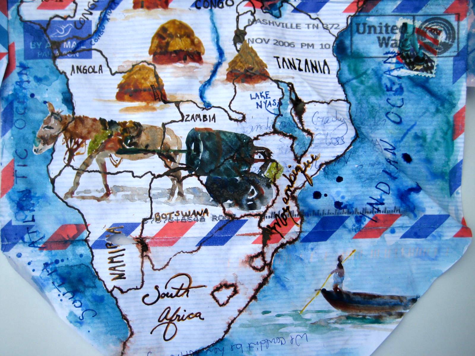 This is one of those “old into new” projects I talked about in a previous post.  I took envelopes from letters that were sent to me from friends in Africa and glued and taped them together and painted this map of Africa on them.  I love how you can see notes that were written to us on the envelopes, postage stamps from Africa, and the beautiful pink color of one of the envelopes – I think it adds some character to the painting and preserves some precious things to me in a very neat way.  I added things on the map that are unique to Africa and to some of my friends that are there.  You’ll see some of the creatures and critters (love and hated) from Africa, some of the people, houses, trees, air planes used to bring in supplies and people, and even a hospital that our friends worked at.  If you click on the main picture you can see a larger version of it (after clicking on the large picture, if you’ll place your cursor at the bottom right hand corner a box will come up with arrows on it – click it and  you can see it even larger – all the pictures on this blog should do that) and you can also click on the thumbnail pictures to see some details of the map.