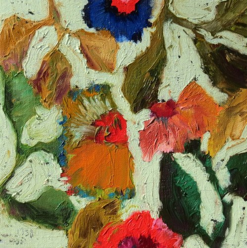 oil bar flowers green background, Sandi Hester, oil 8×8
