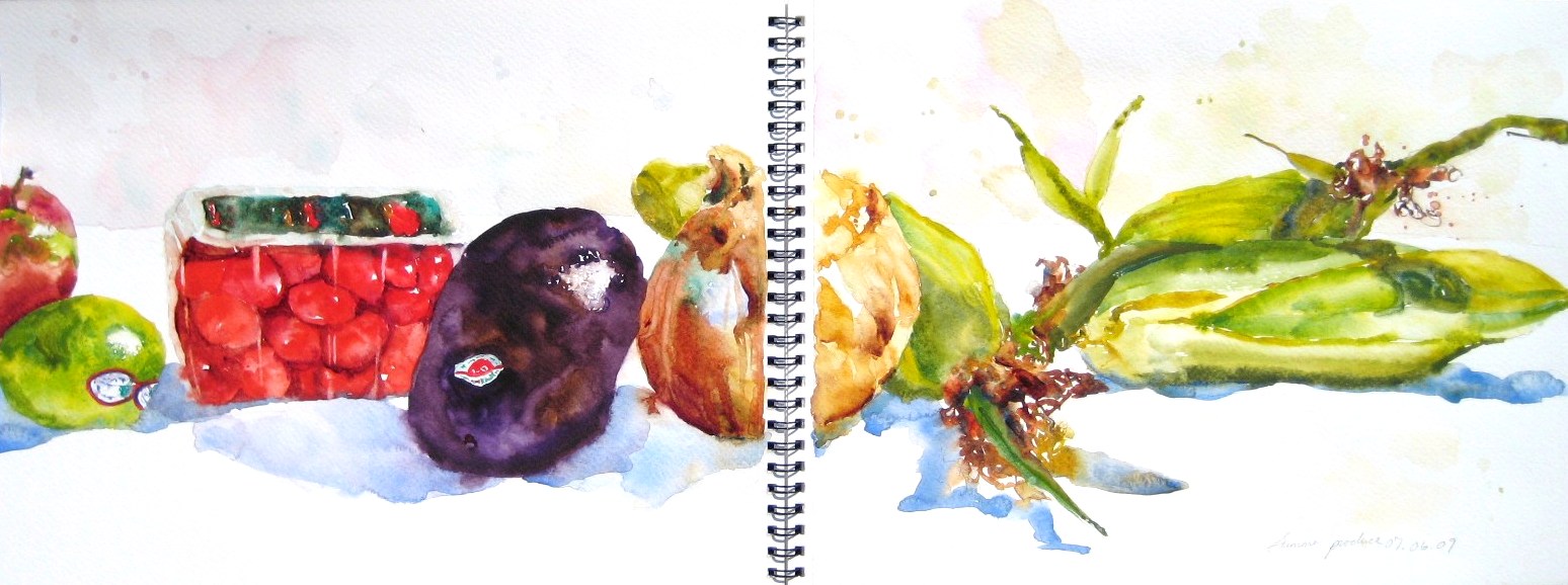 This week in class I’m going to teach my students how to do contour drawing and how to measure to get the right scale of things. We’ll be doing this by painting from a simple still life set up so I’ve been sketching several still lifes lately. Since I’ve moved my “art studio” to the bonus room (because I had to make the breakfast room back into a breakfast room for the sake of selling our house) I’ve had a lot more room to spread out. I have a table I’ve set up with a light source and I’ve been doing little fruit and veggie still lifes – I’ve really been enjoying it. I can just paint whatever I buy from the grocery that week. Sketches are so much fun to do because you’re not worried about painting a master piece – the point is to just have fun practicing your painting skills and enjoy the paint flowing on the paper. AND if the painting turns out resembling what you are painting then that’s just a plus in my book.
