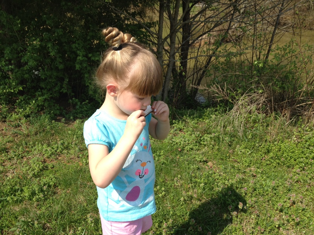 So, after our painting time we went out to the pond to visit our geese and feed them. Hannah wanted to carry her bread in a cute little basket and she wanted to take the harmonica to serenade the geese. The last photo really captures how she was feeling when she was “playing” a song for the geese – she wanted to play very softly for the momma goose because momma was on her nest and Hannah didn’t want to scare her. It was a wonderful day and I wanted to share a little bit of it here with you guys. You can also see little glimpses of my art room in the pictures – hint hint – next post has to do with the art room. Please click on the pictures above to see them larger.