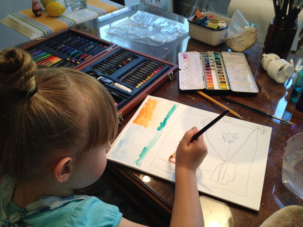 My beautiful niece, Hannah, comes over to have paint days with her Aunt Sandi. We try to do some kind of art lesson together. She’s very talented and loves to do art! The last two lesson’s I’ve taught her how to set up a still life to paint and then we work on lessons revolving around a still life set-up – like deciding what simple shapes we can break the objects down into (like a circle, square, etc.). You can see the still life set-up we did (mostly designed by Hannah herself) and the quick sketch I did for her to help her see the size and simple shapes the objects can be when put down on paper. She did a great job, but more importantly she had a blast painting. The first time we ever did a still life she spent more time setting up her still life than anything else – she really liked designing it. It was really cute!