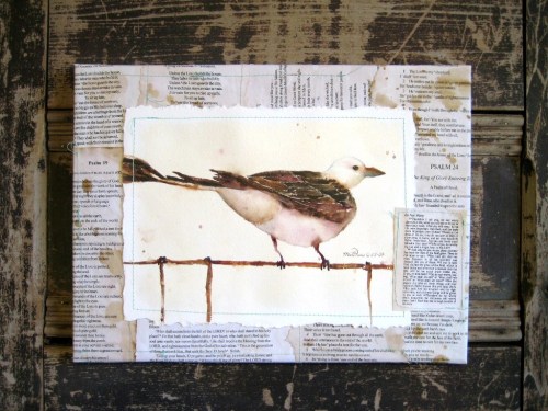 Over the weekend I went to a wedding shower of a dear friend who is a godly young woman. I wanted to give her something special – I worked for days on this painting and was pleased with how it turned out. I did something new with this painting – something I’ve wanted to try for a while. Watercolor usually has to be framed because it has to be protected, but I did this one on paper and then mounted it on canvas. You can’t use watery based mediums to seal a watercolor painting but I found that you can use wax – wax like you use to seal furniture. I’m not sure how it will stand the test of time – it could look really bad in 30, 50, or a 100 years but you never know until you try :). The wax turned the white paper a little yellow but I like that aged look. I’ve also wanted to try adding some sewing to my paintings. I sewed on the painting itself and I also sewed all the hand-aged/hand-torn papers together. I wanted the strings to hang and show – I liked that look with the bird – kind of reminds me of a bird’s nest. I’ll be posting more birds soon – you’ll get to see what this little birdie was inspired from.