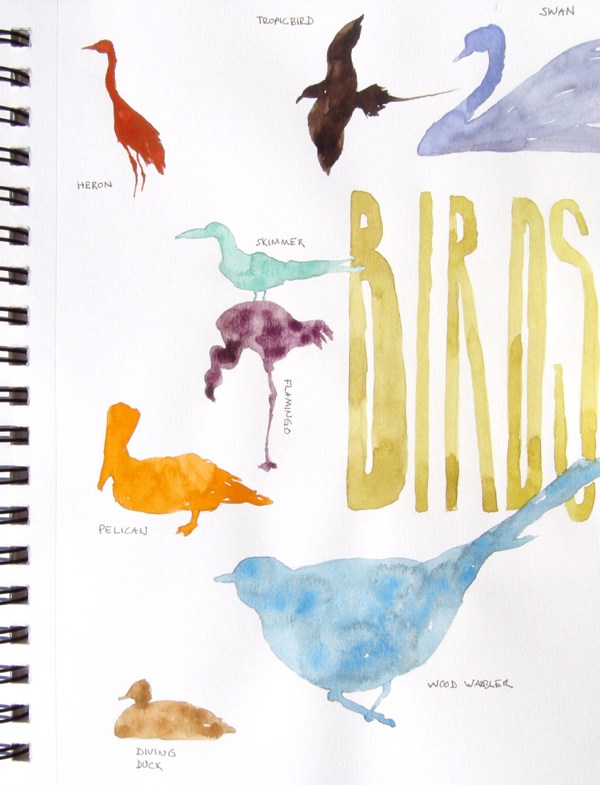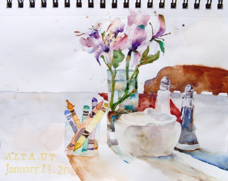 Is that a bird sound? I was having a hard time thinking of another bird noise :). This wraps up my bird posts for now. The middle painting is what inspired the bird painting you saw that I did for my friend’s wedding gift. The last painting is a sketch I did on the trip I did all these bird paintings. It’s a sketch I did of the dining room table of the place we stayed. I went down for lunch one day while Grady was skiing and painted the table setting – I was drawn to the crayons, flowers and the light hitting the table.