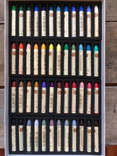 I just got in a whole new box of oil pastels. It’s a medium I’ve dabbled in for sketching but I only have 4 colors and I thought this could be a good medium for sketching this summer – we have a lot of travel coming up. First things first when getting something like this is to do a color chart. I’m a total art nerd and I love nothing more than doing color charts – especially with a new medium or new colors. An artist MUST know her medium and how her colors play together and color charts is a great place to start. Besides the fact that color charts are SOOOOOO pretty – or at least I think so. These pastels are like “painting” with colored butter and they make you stay loose. I love a medium or tool that keeps you from getting too detailed AND something that allows you to make marks and keep those marks is a winner in my book!